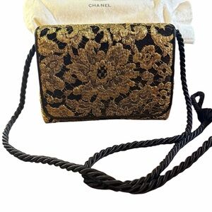 Travel back to the golden era of Karl Lagerfeld for Chanel with this breathtaking vintage evening bag. Produced between 1989–1991 (1-Series), this rare find features intricate metallic gold lace overlaying a luxurious black silk/satin body.