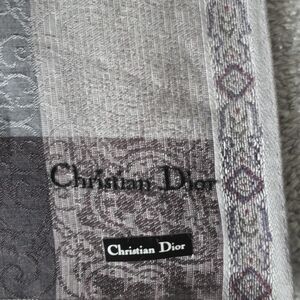 Approx. 19” x 19” in soft 100% cotton. Features a subtle woven Dior monogram pattern in gray and taupe tones with border detailing and logo at corner.