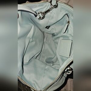 Chic Coach shoulder bag in beautiful Robin's Egg blue leather. Features elegant design with silver accents. Ideal for the upcoming spring season!