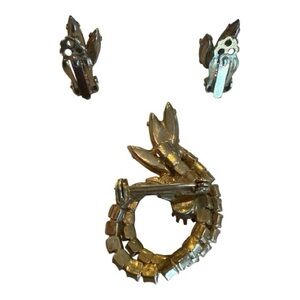 Beautiful mid-century vintage demi-parure featuring a circular wreath brooch and matching clip-on earrings in gold-tone metal.