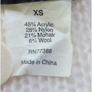 Delicate, beautiful and so soft this sweater is a mohair blend and is a fine knit. Features: shawl collar, pullover, and long sleeves. 45% acrylic 28% nylon 21% mohair 6% wool, hand wash, dry flat. Approx measurements laid flat: length 26" sleeves 22" chest (p2p) 19". Manufactured 2009, Y2K.