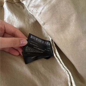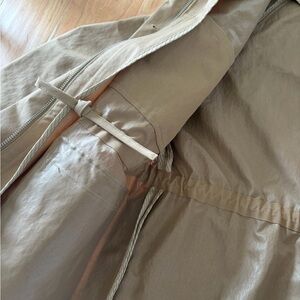 Elegant beige trench coat with button closures. Features large front pockets. Ideal for layering.