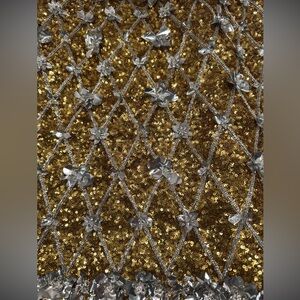Flirty and glamorous, this dazzling gold sequin mini dress is embroidered with a lattice-grid of silver metallic floral and leaf-shaped paillettes that catch the light at every angle.