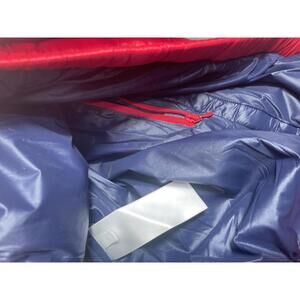Women's/and or Men's Unisex puffer jacket by Tommy Hilfiger featuring a colorblock design in navy blue, white, and red.