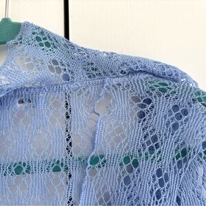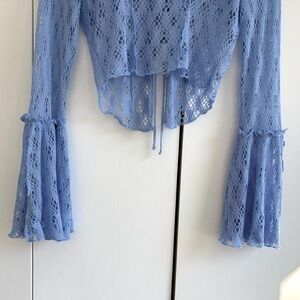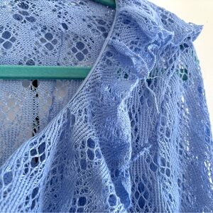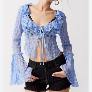 Urban Outfitters UO Gossamer Crochet Flyaway Top in Blue. Ruffle neckline detailing. Bell Sleeves with slit in them. Front ties. Longer in front, shorter in back. Some holes and loose threads (see photos). Size small