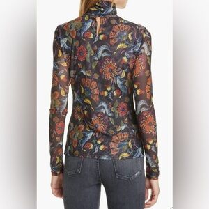 Cinq à Sept Paisley Print Turtleneck. Floral paisley boldly flourishes across a stretch-mesh turtleneck that's double-layered through the body and left sheer at the sleeves.