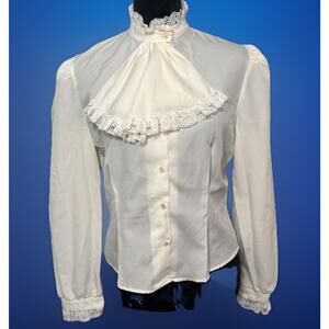 This vintage La Bene blouse is a romantic and elegant addition to any wardrobe. Made from sheer and lace ivory polyester material, the Victorian-style shirt exudes a cottagecore prairie charm. With a size L regular fit, this 1970s blouse can be dressed up or worn with jeans for a versatile and timeless look. Perfect for women who appreciate classic and feminine fashion.