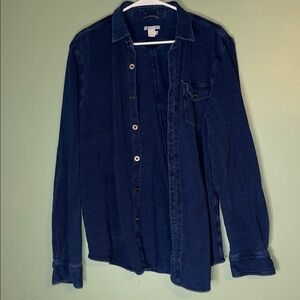 No flaws I could find. Nylon exterior and down interior. Blue/purple color.