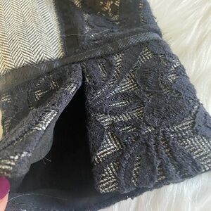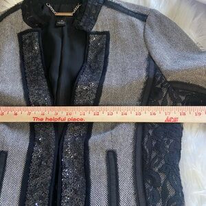 This elegant wool blend women's jacket features a sophisticated black and gray herringbone design, lace & sequin embellished, 3 hook & eyes for front closure, completely lined, and perfect for any occasion. The stylish cut and detailing make it a standout piece in any wardrobe. Great condition and ships next day.