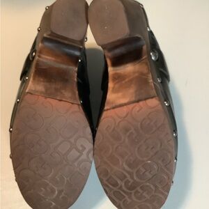 Elegant black leather mules with braided detail. Features a sturdy wooden heel and stud accents.