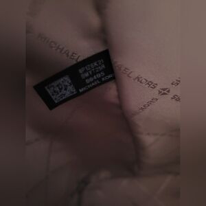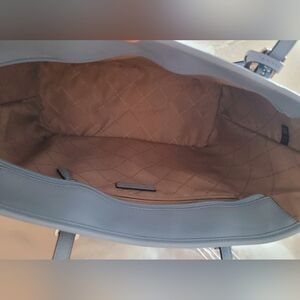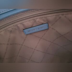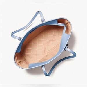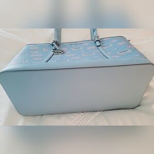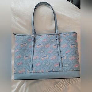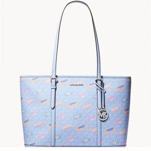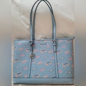 Stylish tote with iconic MK pattern. Light blue with vibrant accents. Ideal for daily wear.