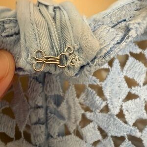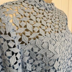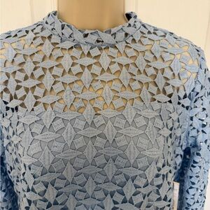 Stunning AQUA lace sheath dress in a soft sky blue, originally from Bloomingdale’s. Features an allover geometric lace overlay, elegant mock neckline, long sleeves, and a flattering knee-length silhouette. Fully lined through the body with sheer lace detailing at the shoulders and back for a polished, modern look.