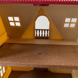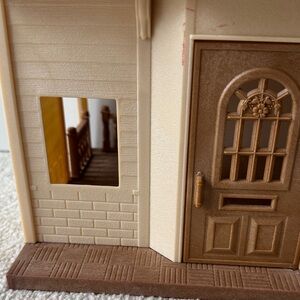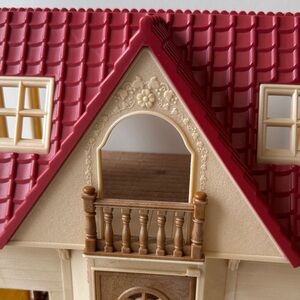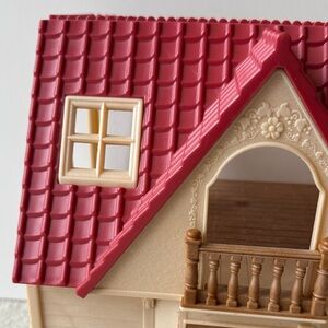 Adorable dollhouse with a red roof and cream walls. Features intricate details and a brown door with 2 story home.