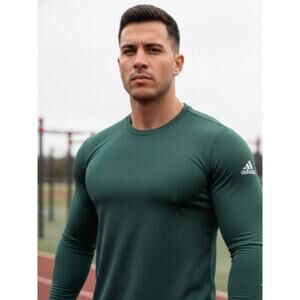 Dark green Adidas long-sleeve performance shirt in size Large. Classic crew neck style made from lightweight 100% polyester, perfect for workouts, training, or casual athleisure wear. Moisture-wicking performance fabric helps keep you cool and comfortable.