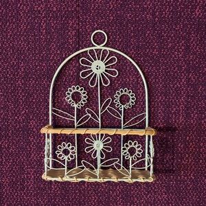 Charming floral wire wall shelf with a natural wood base. Perfect for adding a touch of whimsy to any room.