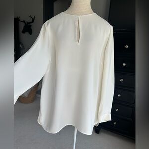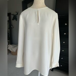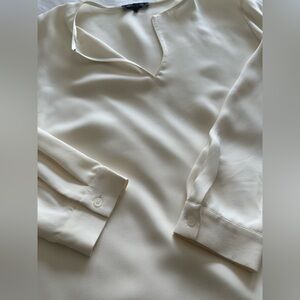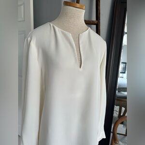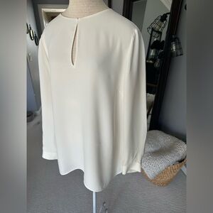 Sophisticated cream silk blouse with keyhole neckline by Lafeyette 148. Size XL. Measurements in pics, longer tunic style, flowy and very pretty on. Luxury brand, beautiful quality and ideal for versatile styling. Happy Poshing.