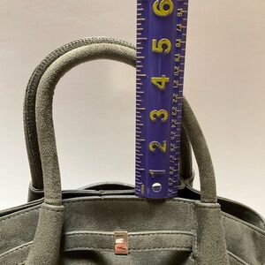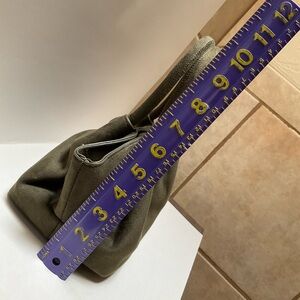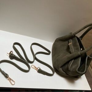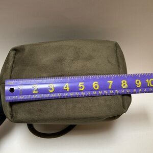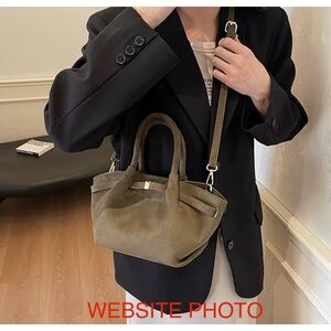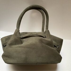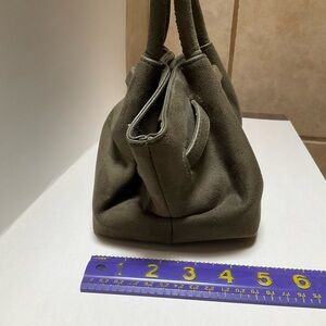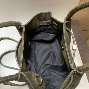 Unbranded, small olive green, suede mini tote, Crossbody. NWOT. Never used, no tags. Slight crease on back of bag.