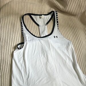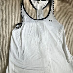 Chic and sporty tank top by Under Armour. Features a black trim and white body. Ideal for workouts or casual outings.