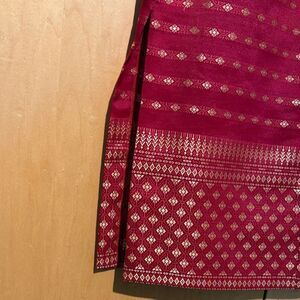 This elegant red and gold skirt features a beautiful pattern, perfect for any occasion. Its vibrant color adds a touch of sophistication to your wardrobe. It is a custom made red and gold skirt with material from SE Asia. Side slit, hook and bar closure with hidden zipper. Darts in back and front for elegant fit.