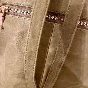 Stylish olive green leather backpack with gold accents. Perfect for everyday use. Excellent condition! No tears or marks. Multiple pockets, very spacious! Adjustable straps. White & blue striped interior, so cute!