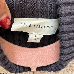 This Free Assembly geometric knit sweater blends timeless design with cozy sophistication. Crafted from a soft, mid-weight knit, it features a striking colorblock pattern with rust and pink diamond motifs across a navy body, complemented by a cream mock neckline. The relaxed fit and ribbed trim at the hem and cuffs add shape and structure, while the high neck offers extra warmth for cool-weather styling. Perfect for pairing with denim or corduroy pants for a casual yet polished winter look.