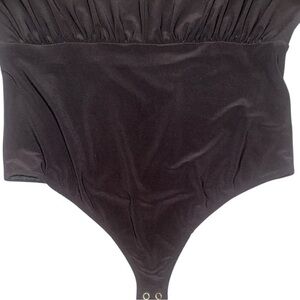 This chic black bodysuit from Express features elegant puff sleeves and a fitted silhouette, perfect for a stylish and modern look. The ruffled details add a touch of sophistication, making it a versatile piece for any occasion.