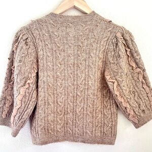 Gorgeous cardigan from Anthropologie’s Maeve line featuring a richly textured cable knit design with soft ruffle trim and stunning jewel-style buttons. The warm taupe / beige tone makes this an easy, versatile statement piece. Subtle metallic embellishments add beautiful detail and dimension.