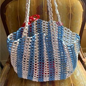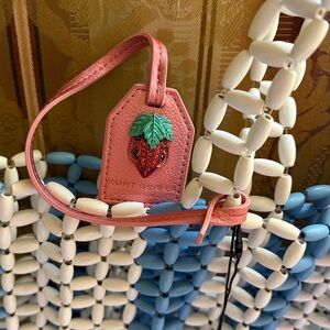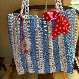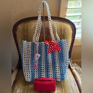 Nwt Kurt Geiger Kensington Beaded Shopper. Features Elongated Beads, Double straps approx. 12”, Blue & White Striped design, Metallic Kurt Geiger Pink Tag with Unique Strawberry Eagle Head. (Retail $225) Comes with (Nwot) Red/White Polka dot scarf & Nwt Red Zipper Pouch approx. 7” x 3”. 3-Piece Bundle Deal.