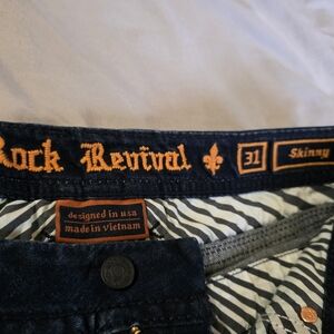 Dark blue classic Rock Revival jeans in the style Rosemary. These are in awesome shape! They are pre-owned but have not been worn many times. They are technically skinny jeans, but they have more of a straigh-leg fit.