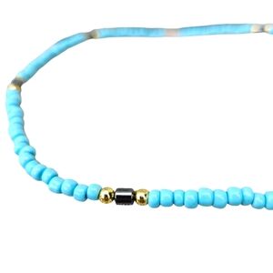 Handmade Beaded Choker Necklace 17" Turquoise Blue Seed Bead Gold Black Boho