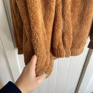 Warm and plush brown fleece hoodie with a zip-up front and pockets. Perfect for casual wear. Size large, super warm and soft.