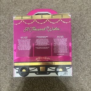 Charming gift set with a festive theme. Includes two pink nail polishes and a fragrance. Perfect for holiday gifting.
