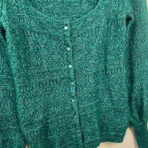 Sézane Esmée cardigan sweater featuring a square neck, button front closure, puff sleeves with fitted cuffs, intricate knitting techniques throughout, and a soft, fuzzy, mohair/wool/synthetic blend yarn in a pretty shade of emerald green. Almost teal.