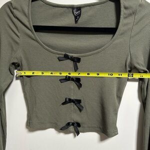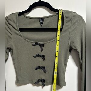 Discover effortless style with this olive green long sleeve crop top, featuring charming bow accents. Ideal for casual outings.