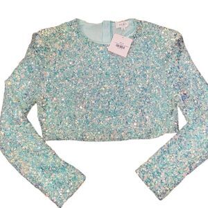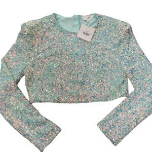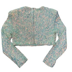 mint sequin, padded crop top, party wear, shimmery, glamorous, oversized, vintage-inspired, glittery, sparkle, statement piece