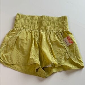 New with tags Free People Movement running shorts in a bright pomelo yellow shade. Lightweight, slightly crinkled performance fabric with a relaxed flowy outer layer and built in stretch liner for comfort and coverage. Features a wide elastic waistband for a flattering, secure fit and easy pull on style.