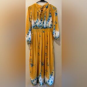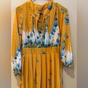 Charming dress with a vibrant yellow base and blue floral patterns. Features long sleeves with floral accents.