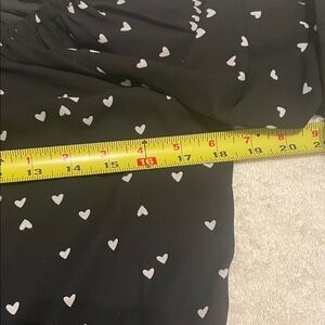 Chic and stylish off-shoulder blouse featuring black with white heart print. Perfect for casual outings or a night out. Ruffle sleeves with elastic waistband and tie. 100% polyester.