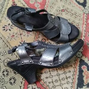 Beautiful silver leather sandals with cushioned footbed and gorgeous silver stud details. Heel height (approx 3") is perfect for dressing up or down and for comfort as well.