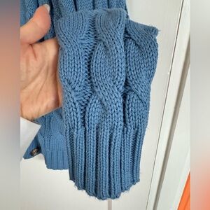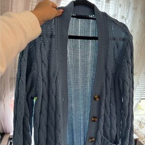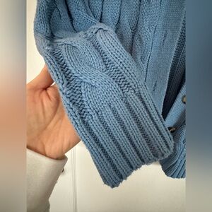 Cozy and stylish blue knit cardigan. Perfect for layering- featuring front buttons, small pockets and a loose cable knit pattern. In great condition.
