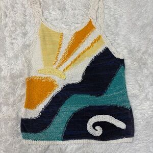 Vibrant tank top with abstract design. Features yellow, blue, and green hues. Perfect for casual wear. Excellent used condition.