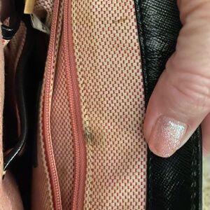 Chic shoulder bag with a black and brown pattern. Features a secure magnetic closure. Ideal for everyday use. This bag is in EXCELLENT used condition. It is made of coated canvas or something similar. The bag is very clean with just a couple of tiny dirt spots that could probably be removed very easily with a little soap and water. Lining folds out to make cleaning easy breezy! Lovely bag! Please see all photos as they are part of the description. I live in a pet-friendly, smoke-free home.