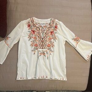 Johnny Was Workshop White Blouse Orange Pink Floral Embroidery