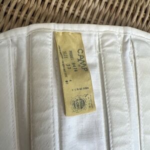 This product is a rare vintage Camp corset back brace from the 1960s. The corset is in mint condition and features a classic white color. Known for its quality and style, the Camp brand is highly sought after by collectors of vintage lingerie. This unique piece of women's vintage clothing embodies the fashion trends of the 1960s era and is sure to be a valuable addition to any collection.