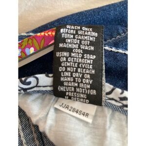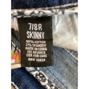Low-rise skinny jeans in a dark wash with subtle fading and whiskering for a lived-in look. These classic five-pocket denim pants feature decorative embroidery on the back pockets and a comfortable stretch fit. The interior waistband is lined with a contrasting floral and paisley pattern, adding a unique hidden detail to this everyday staple.