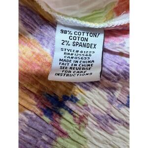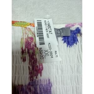 This bright floral top pairs perfectly with slim-fit white denim and a tan leather sandal for a polished, garden-party aesthetic. For a more casual afternoon, layer it unbuttoned over a simple linen tank with relaxed khaki trousers to emphasize the texture of the crinkle cotton. Habitat Clothes To Live In is recognized for prioritizing comfort and artistic expression through unique fabrications and effortless shapes. The brand focuses on the longevity of style rather than fleeting trends, ensuring each piece feels both personal and enduring. This button-front shirt is crafted from a textured crinkle fabric made of 98 percent cotton and 2 percent spandex for just enough stretch to maintain its shape. It features a flattering V-neckline, long sleeves, and a curved high-low hemline that provides excellent coverage. This garment is brand new with tags in a size XXL and features a multicolored floral pattern on a white base.