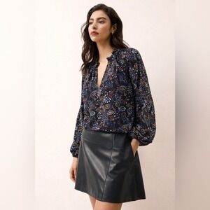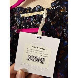 NWT. Lennon blouse in Mystic Art print showcases an intricate, hand-drawn celestial and evil eye motif on a luxurious black silk base. This elegant top features a ruffled high neckline with a split V-neck opening and voluminous long sleeves finished with elasticized cuffs. The fluid silhouette is enhanced by delicate pleating at the shoulders and back. Length 24in, pit to pit 23in, sleeve length 23in.