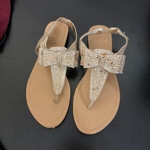 Shimmering gold sandals with sparkling bow detail. Ideal for stylish outings.