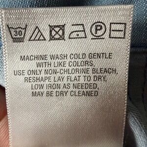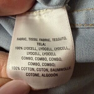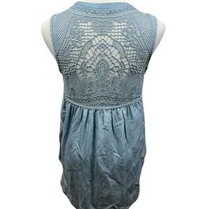 Holding Horses Anthropologie sleeveless chambray top in a light wash blue. This versatile piece features a button-down front with a classic V-neckline and intricate crochet lace detailing on the back and shoulders. The lightweight lyocell fabric offers a soft, fluid drape, while the cotton lace adds a feminine, bohemian touch. Designed with a slightly flared hem and a high-low silhouette for a relaxed yet polished look.