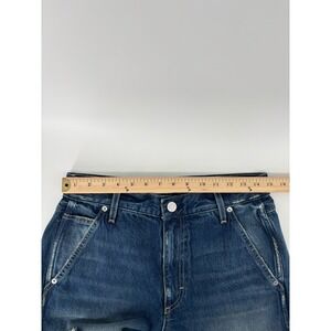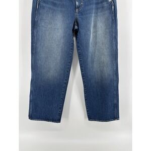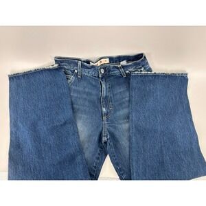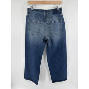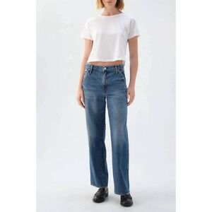 The NWOT AMO Jocelyn Trouser Size 27 (Meas 29) in a relaxed wide straight leg fit is a stylish pair of jeans with a high-rise waist. Made from 100% cotton denim in a solid blue color, these jeans feature a classic button and zipper closure, as well as pockets for added functionality. Perfect for all seasons, these jeans offer a comfortable and versatile option for any casual or everyday outfit.